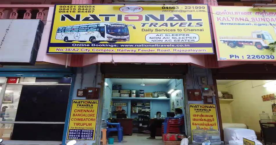 | National Travels | Office: 6/624, Madurai Road, Virudhunagar – Opp PRC Depo. Opens daily from ~ 9:00 AM to 9:00 PM. Services: Bus‑service bookings, tour‑packages, car/coach rentals, customised itineraries — good for inter‑city travel or longer trips. |