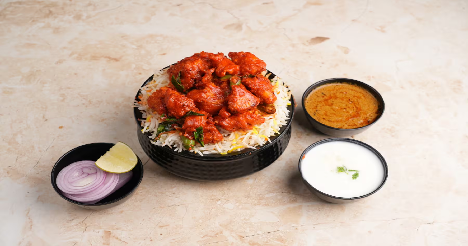- What: Classic biryani layered with spicy Chicken 65 pieces