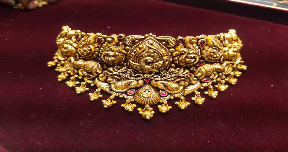 Temple jewelry designs inspired by Chola art — including earrings, necklaces, and anklets.