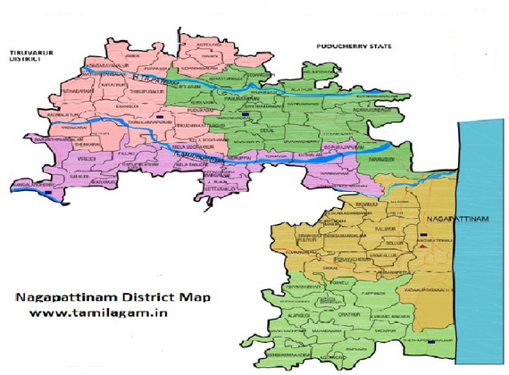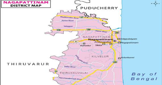 Nagapattinam district lies between Thanjavur to the west, Karaikal (Puducherry Union Territory) to the north, and the Bay of Bengal to the east.