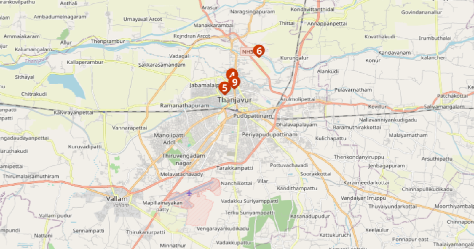 - The main Thanjavur Bus Stand is located outside the city center, connecting to surrounding cities.